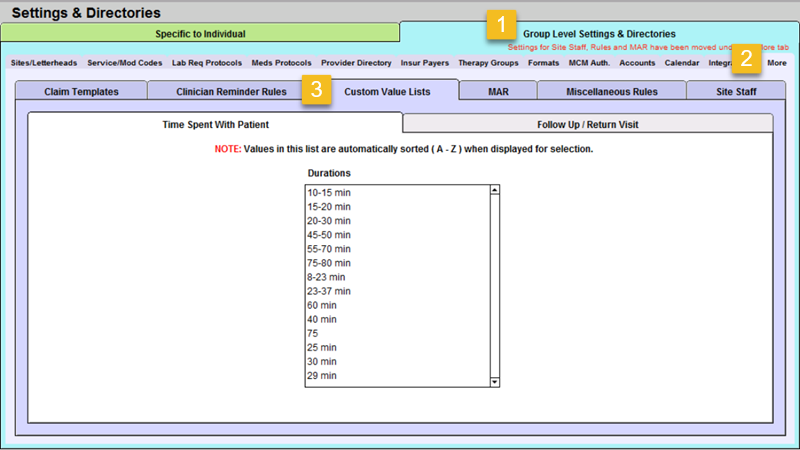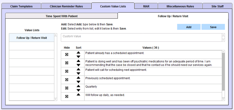 Custom Value Lists allow group administrators to manage the content lists for certain fields in progress notes, such as the Follow Up/Return Visit dropdown and the Time Spent values. This article will outline steps for group administrators updating values in each available custom value list in ICANotes.
