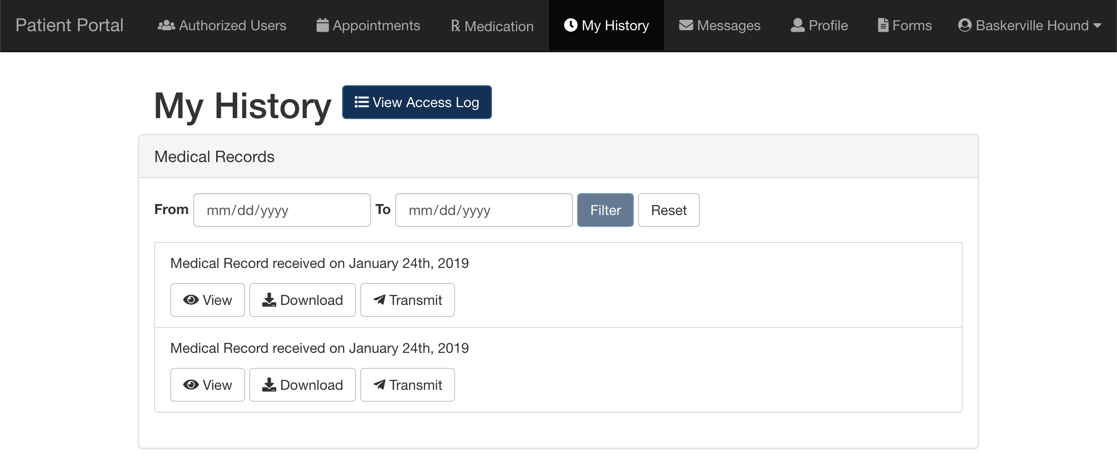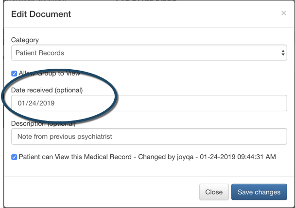 The Note from previous psychiatrist was uploaded to the patient's record and made available for the patient to view. A Security Administrator or Group Administrator can change the date received as necessary.