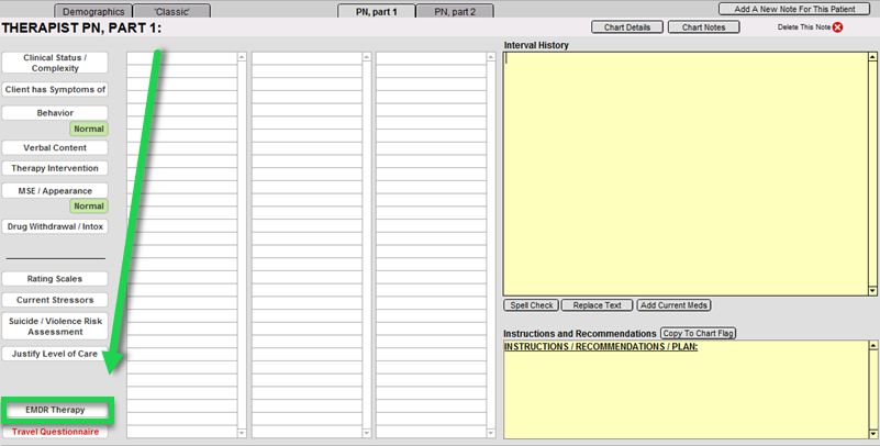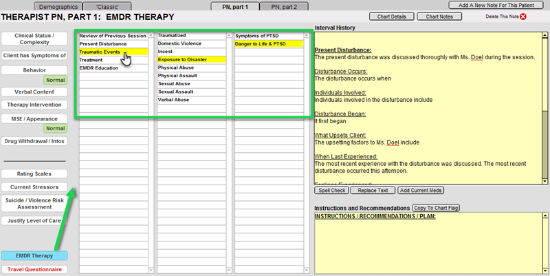 ICANotes is pleased to introduce EMDR (or Eye Movement Desensitization and Reprocessing) related content into its already expansive "shrub" content library. This new clinical content can be found in the "new" Therapy Progress Note (as opposed to the "classic" note style).