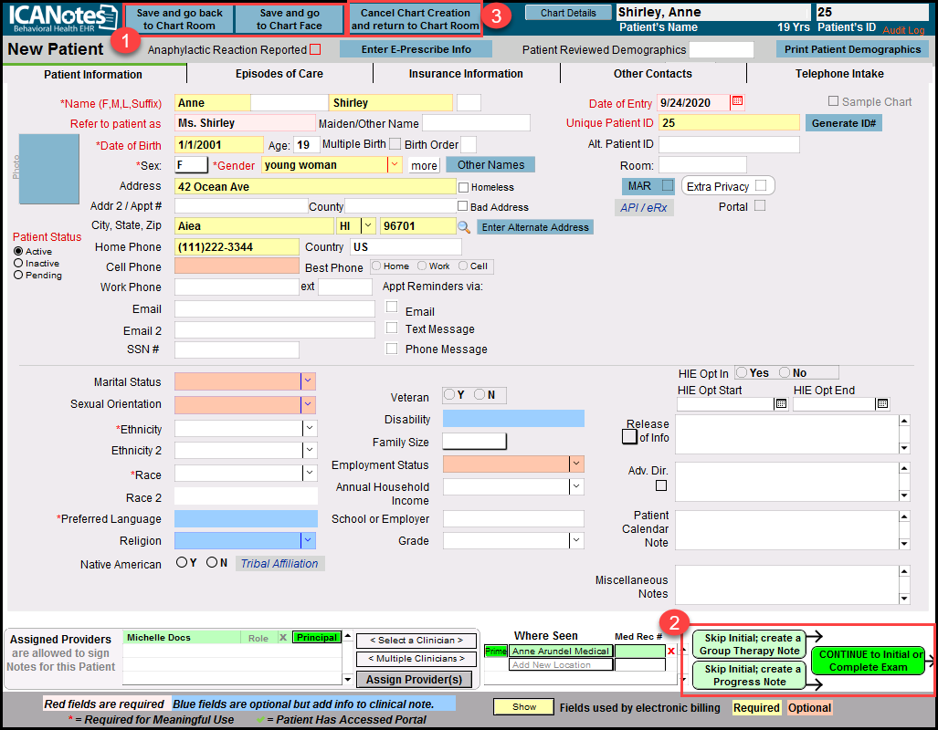 2. 'Continue to Initial or Complete Exam'. Skip Initial; create a Group Therapy Note' and Skip Initial; create a Progress Note' will all take the user to the respective note type after saving the Demographic Information.