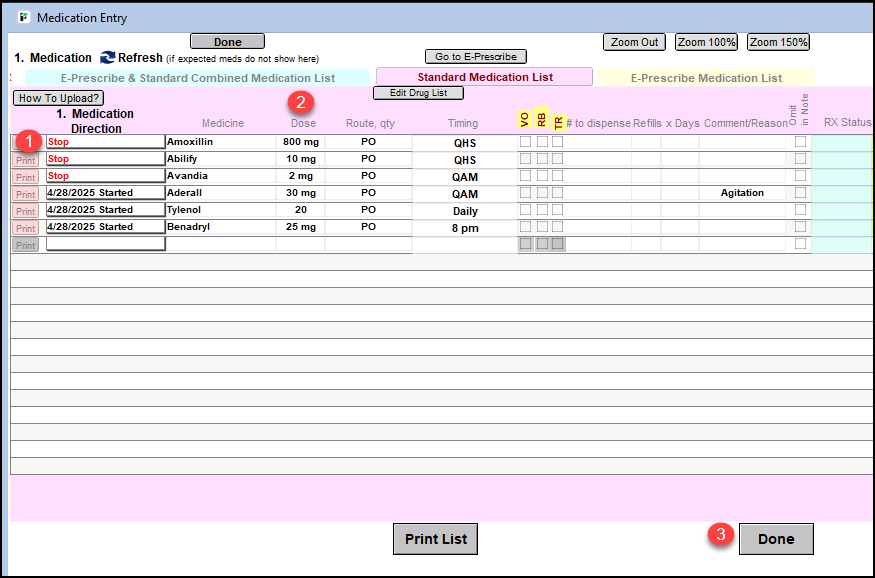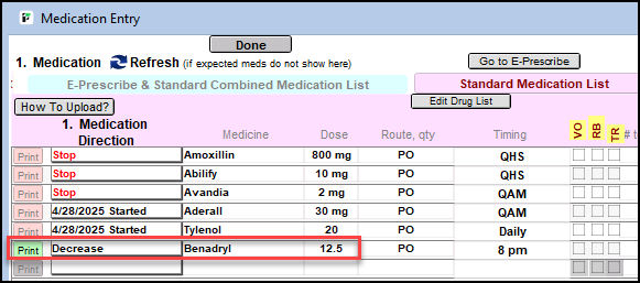 If you need to change (decrease/increase) or stop a medication, always update (from a new note) the verb and then adjust the dose, route, and/or time as needed. Be sure all five fields are filled in as blanks are not allowed.