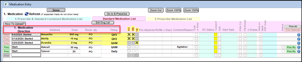 2. Be sure to fill in the fields: Medication Direction, Medicine, Dose, Route, and Timing. You will receive an error message if you miss one of these five fields. You can also include additional optional fields such as # to dispense, X Days, Start Date, and a Comment/Reason.