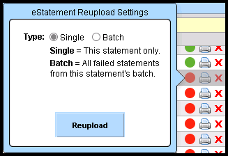 Statements can be re-submitted by clicking on the dot, selecting single or batch, and clicking 'Reupload'.