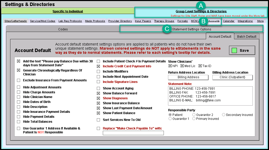 4. Navigate to the Group Level Settings & Directories tab (A), then the Accounts tab (B), and finally the Statement Settings Options tab (C). Evaluate your Account Default and Batch Default settings and make any desired updates, making sure to click the