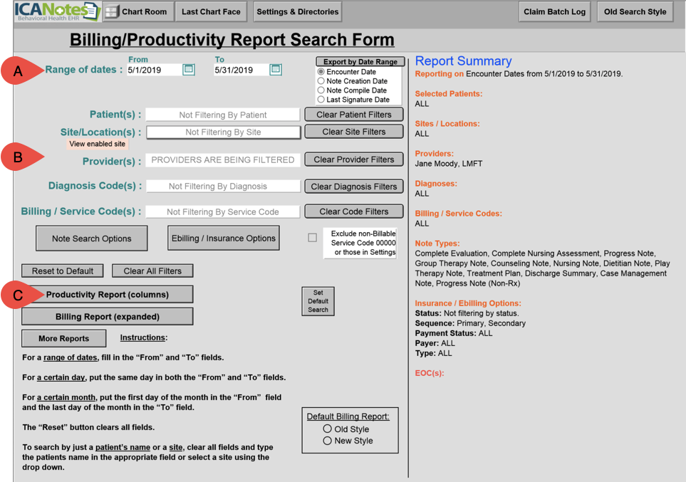 2. In the Billing/Productivity Report Search Form: