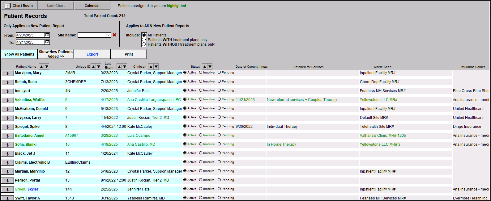 The results also show Date of Current Illness, Referred for Services, Where Seen, Insurance Carrier, and Insurance Carrier 2. The Patient Records report can be printed or exported to Excel. ICANotes users may also use the radio buttons under the Status column to change a patient’s status from Active to Inactive very easily.