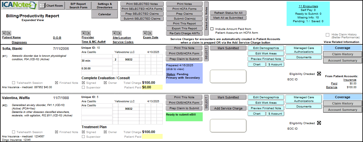 The Expanded version of the B/P report below has buttons for preparing and submitting claims, and viewing the status of claims you have submitted to the clearinghouse. You may also print claims to paper from this report using the button next to each encounter. A similar button at the top of this report will allow you to print all claims in this report to paper. Notice the Select buttons next to each entry in the report. You may use the