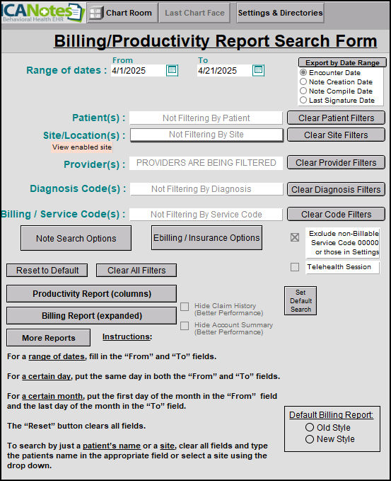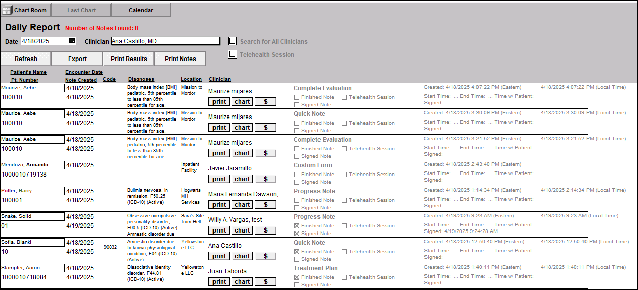 This report is accessible from the Reports dropdown menu. You may use this report to generate a daily list of notes created on the date of your choice by all clinicians or by just one clinician at a time.