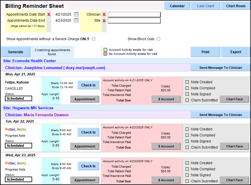 It is easier for office staff to check in patients and enter charges from this report than from the Appointment Book since the schedule will not have to be reloaded each time. By default, the current date is shown, but a range of up to one month can be displayed. Since Block Outs aren’t billable, they are hidden by default. Showing appointments without a service charge is helpful when there are a lot of appointments listed. This report can be printed or exported as needed.