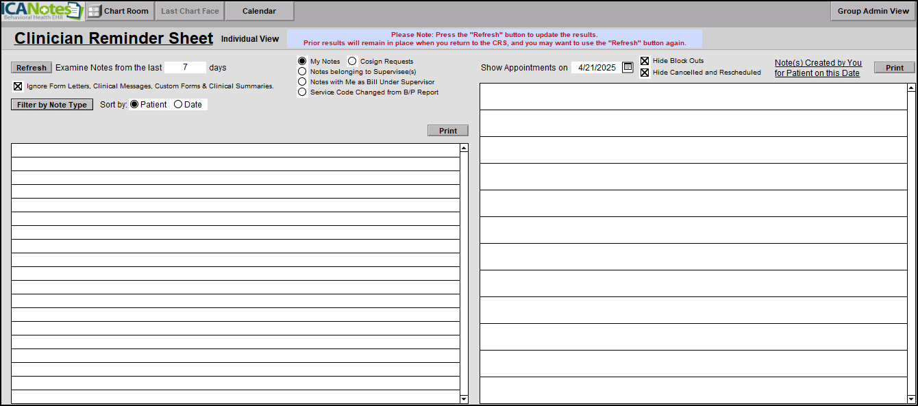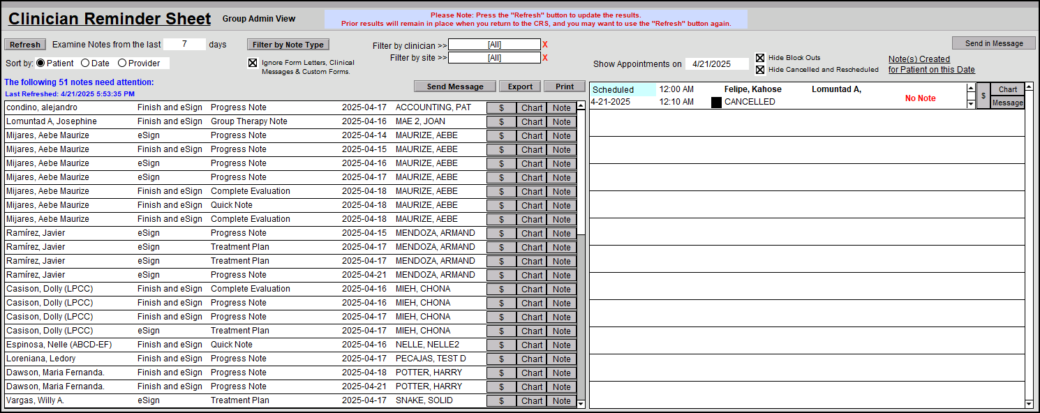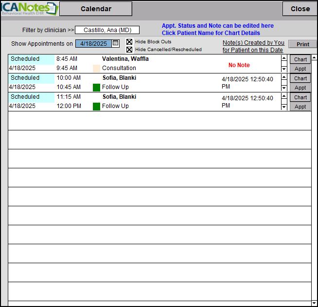 The area on the right side lists the clinician’s scheduled appointments for a particular day and whether or not they generated a note for the patient’s visit. This list replicates the Calendar Quick View report.