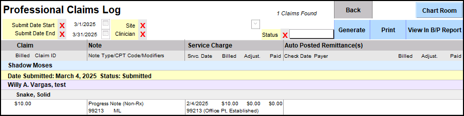 This report is accessible from the Reports dropdown menu. The claim log gives a list of previously submitted claims, note type, service charge, and auto post remittance(s). This list can be viewed in the Billing/Productivity Report by clicking the button.