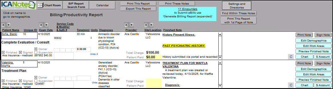 The Columns version of the B/P report below includes a snippet of the finished note. A clinician or supervisor can read the note and electronically sign it right from this page using the button. This report may be printed or exported to Excel. In addition, you can see a button next to each entry that will allow you to print that individual note. If you want to print all the notes in this report, use the