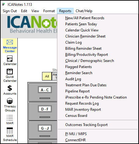 General ICANotes Reports are accessible from the Reports dropdown menu.