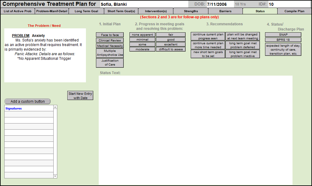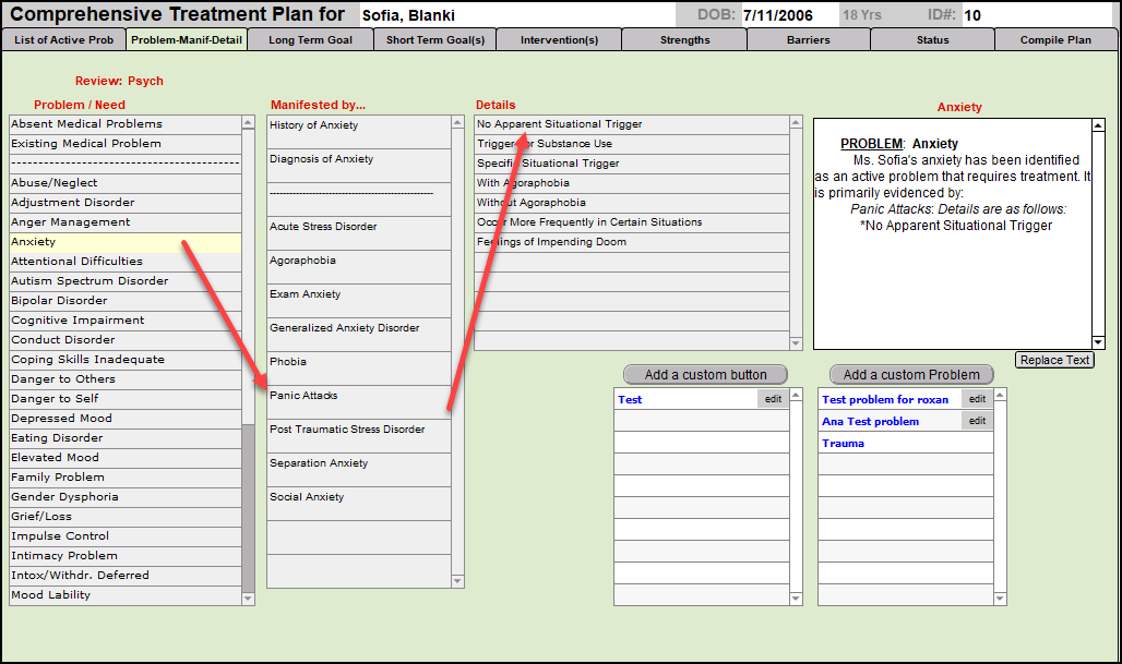 In the example below, Anxiety was chosen as the problem with Panic Attacks as manifestation and no apparent situational trigger as detail. The green box shows the Problem Text that was populated from the choices made for problem, manifestation, and details; you can free text into this field as well. Make sure to go through all of the tabs for the first problem before adding additional problems. You can go back to add more problems at step 19.