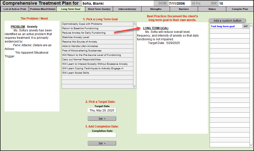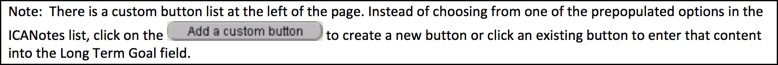 8. When you are satisfied with your problem text, begin working from left to right through the tabs. Click on the tab. You will see several options that ICANotes has prepopulated for your use. If you decide you would like to use one of the long term goals listed, simply click on the goal to put the goal into the Long Term Goal(s) text field on the right. You are able to free text in the Long Term Goal(s) area as well. Pick a target date for the long term goal and click the button. If this is a followup treatment plan, you can set a completion date.