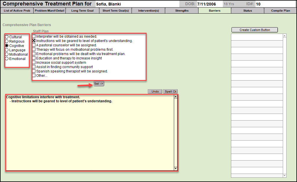 12. Click on the tab. On the left, there is a list of barrier categories. Select a category in which your patient has barrier(s). Select an option from the Staff Plan list that correlates with the barrier category you selected. More than one can be selected. Click the button when ready. The selection(s) will add prepopulated text field. You may opt to type in a specific barrier not in the list or utilize a custom button.