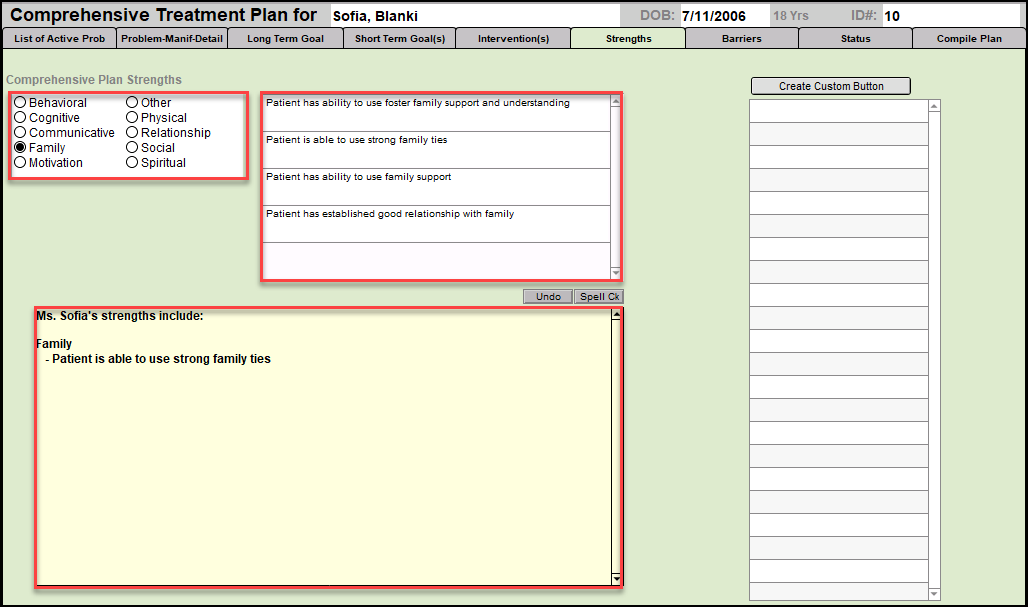 11. Click on the tab. On the left, there is a list of strength categories. Select the category in which your patient has strength(s). The program will offer several pertinent options from which you may select. The selection will add prepopulated text in the text field. You can also type in the patient strength(s) or utilize a custom button.