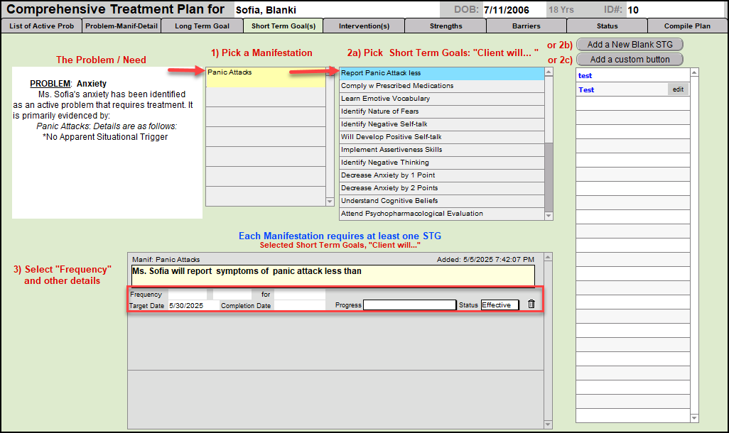 9. Click on the tab. You'll see a list of manifestations based on what you selected as your problem in step 8. Click on the manifestation to reveal a list of prepopulated short term goal options. Select a short term goal and frequency, period and duration that is appropriate for the goal. Add a new blank short term goal by clicking the button. Add a custom button by clicking the button. Completion Date and Status are generally filled out after a goal has been met.