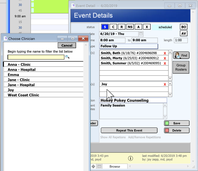 7. You can add Clinicians by clicking in the blank field under the first clinician. The Choose Clinician window will open up.