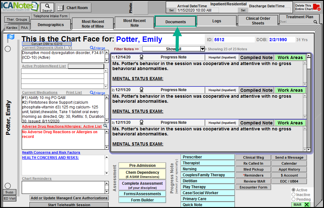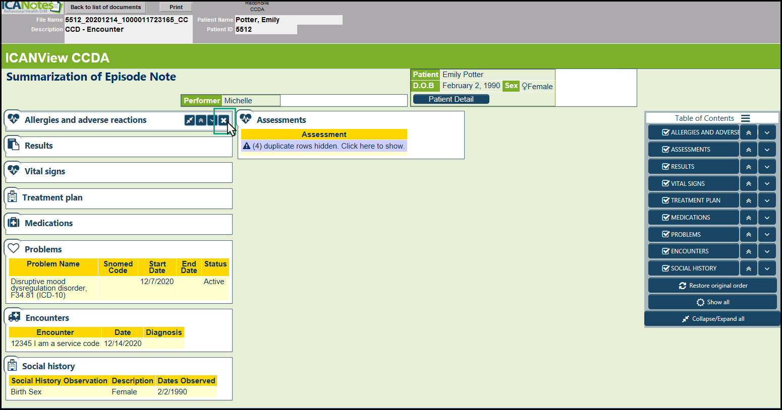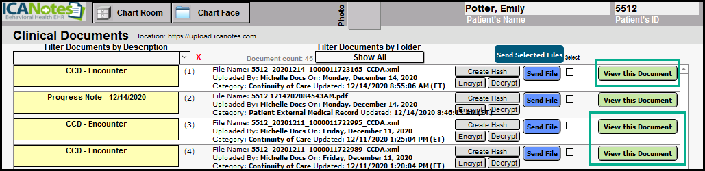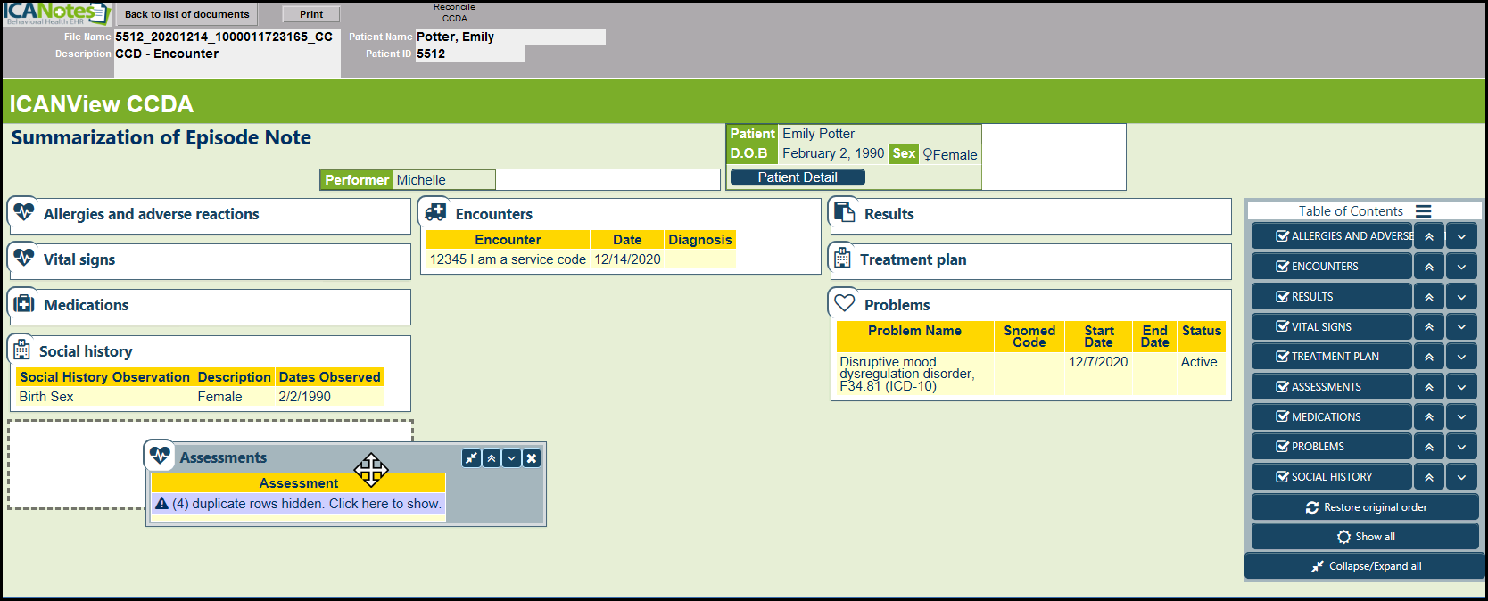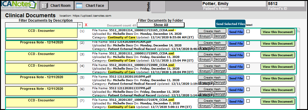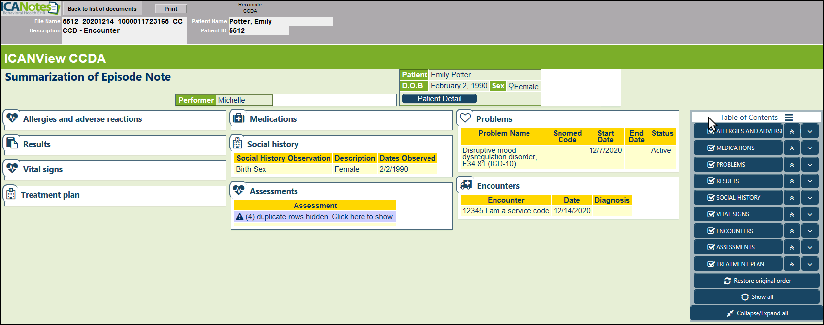 2. Within Clinical Documents, the following areas can be pulled up in the ICANView CCD Renderer. Look to ensure the file is an .xml and the category is Continuity of Care.