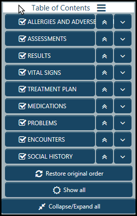 8. The Table of Contents is where you can manage the placement of the individual fields.. You can also restore the original order, show all the content, and collapse or expand all content.