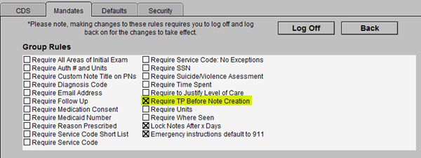 In the June 2020 release, we introduced a new group rule, "Require TP Before Note Creation". When enabled, a clinical user (whose discipline is not Office or Administrator) will be prevented from creating a new progress note until a Treatment Plan exists for the patient. The group rule applies to the following note types: