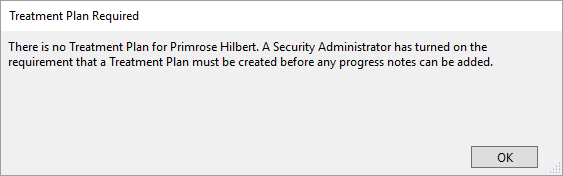 If a clinician attempts to create a new progress note before a Treatment Plan has been completed, they will receive an error alert with the following message: There is no Treatment Plan for this patient. You are required to add a Treatment Plan before creating your note.