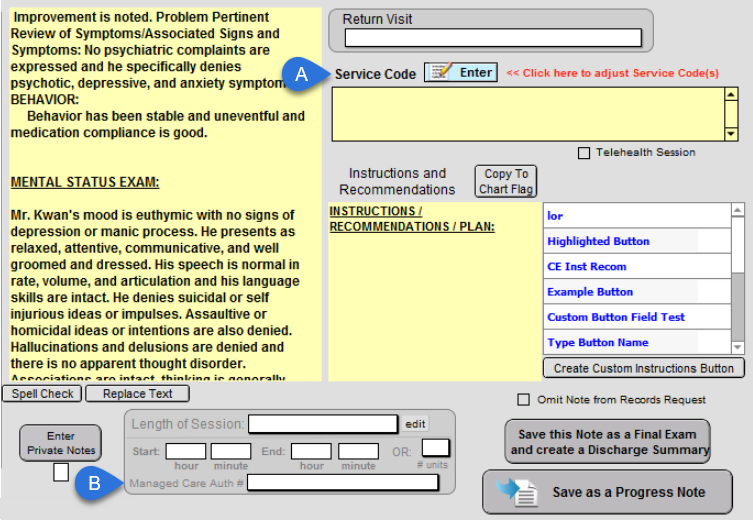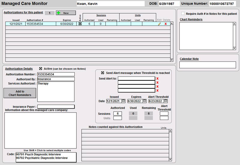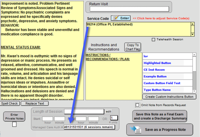 When a note is created for the patient with an active authorization and the specified Code is entered into the Service Code work area, the Managed Care Authorization number will populate automatically for you.