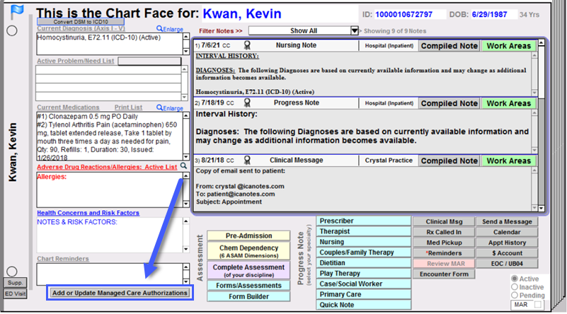 From the patient's chart face, navigate to Add or Update Managed Care Authorizations.