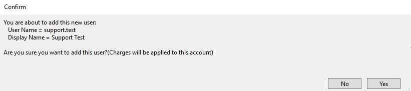 After all necessary information has been entered, click “Save.” A popup window will appear asking if you’d like to proceed (charges may apply when creating a new user - please call our business office at 866-847-3590 if you have any questions about pricing). After the account has been created, you will receive the following confirmation: