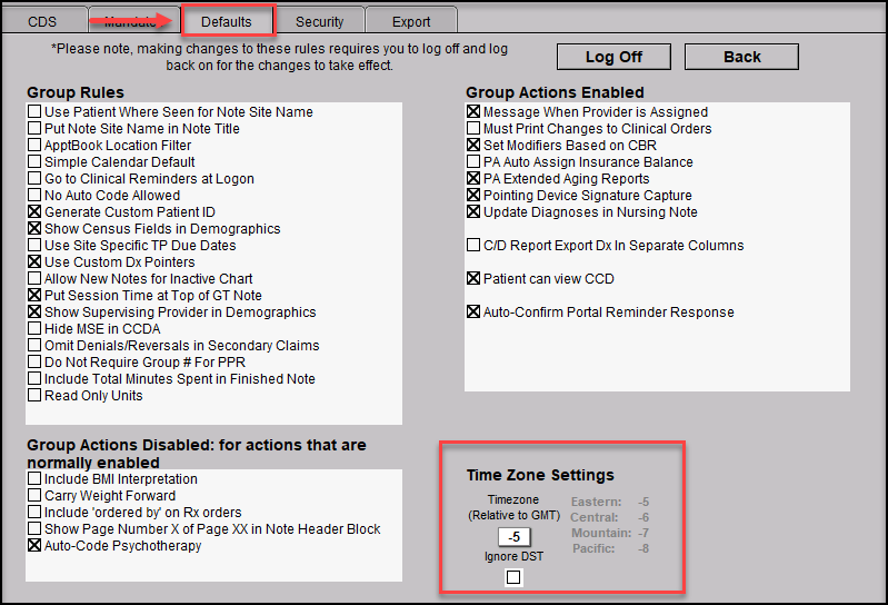 At this point the changes have been completed. For the changes to reflect on the users notes, please have the user log off using the pink log off button in the chart room. Once logged back into ICANotes the correct time will reflect on the notes.