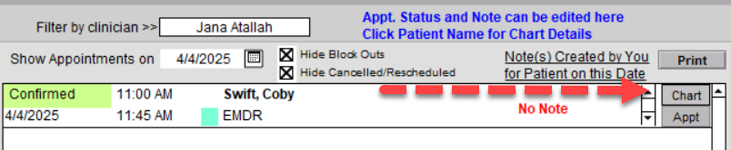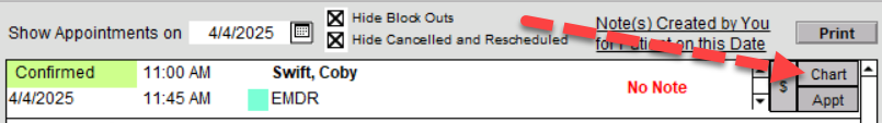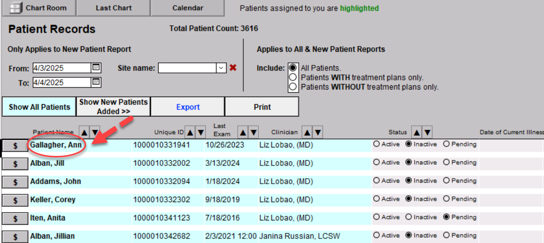 Alternatively, you may narrow the list to only your charts by clicking on the option above the boxes on the left, or simply search for a patient by Name or ID by typing into the