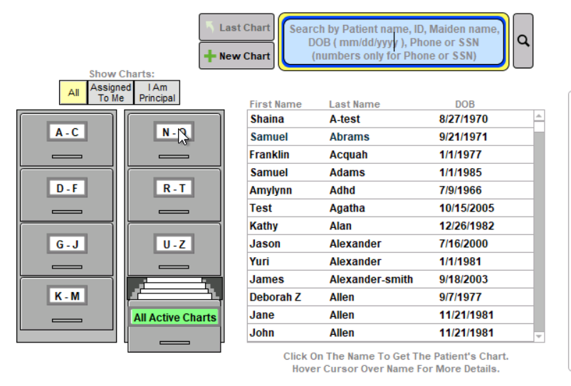 From the main ICANotes Chart Room, look for the two Filing Cabinets on the left where you will find patient charts organized alphabetically (A-C, D-F, etc.). After you click on a drawer label, the names of patient charts stored in that drawer will display in the middle of the screen, in alphabetical order by last name. You can then scroll to the patient name whose chart you are looking for and click on the name to open the patient’s Chart Face.