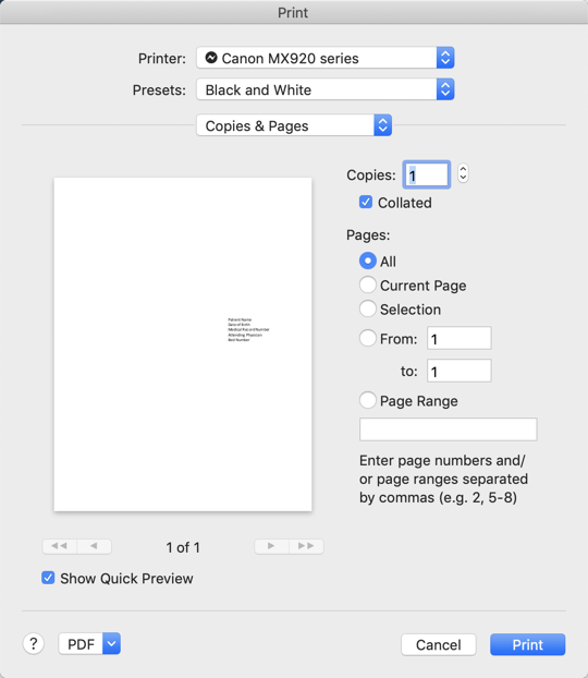 8. When everything looks good, click the button. Once again, you will see where the label will print. Make sure that you have the correct printer selected and number of copies (if desired). When ready, click the