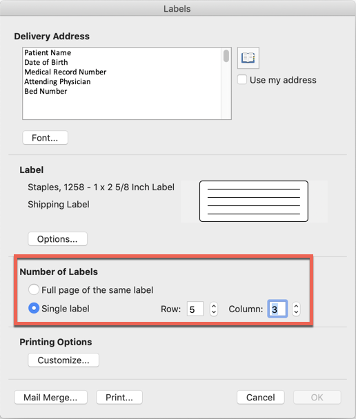 4. When you return to the Labels window, you need to decide if you want a full page of the same label (like if you were making return addresses of your facility) or just a single label. Use the appropriate radio button, and if you are using single, make a note of which row and which column the label will print. When ready, click the button.