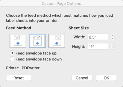 5. On the Custom Page Options, you can decide how to load the label paper. When selected, use the OK button to return to the Labels page.