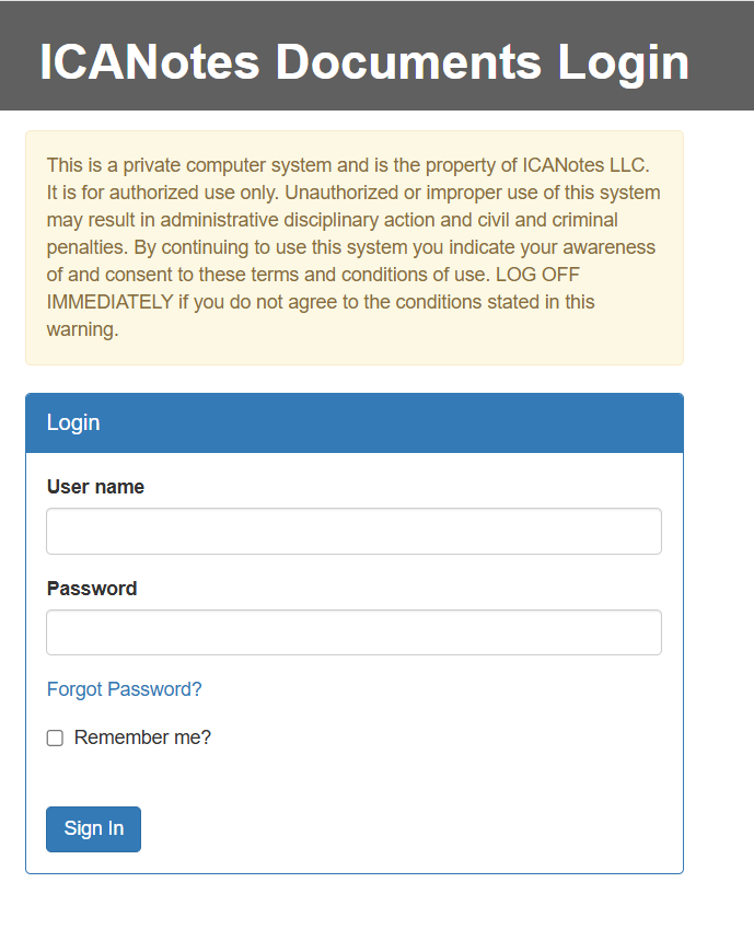 1. Go to https://upload.icanotes.com using your ICANotes username and password, then click the blue Sign In button.
