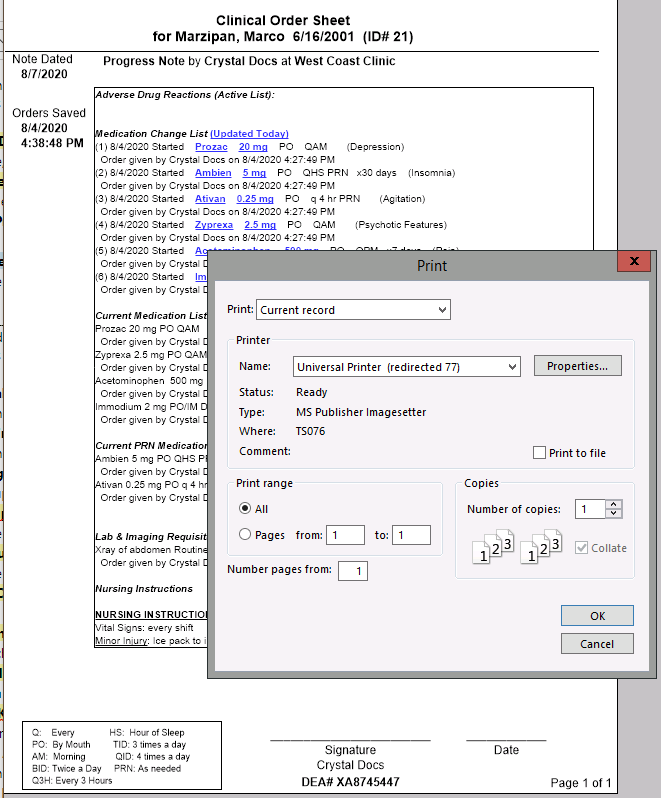1. If you have a printed medication order sheet, compare it against the MAR for accuracy. If you do not have a printed medication order sheet, you can generate one by clicking the Print Clinical Order Sheet button in the compiled note where the medication was prescribed.