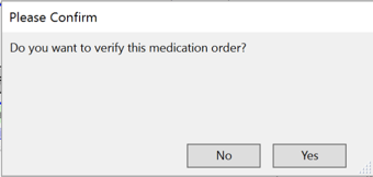 3. You'll see a prompt asking you to confirm verification of the order. Click Yes to proceed. Sometimes a second verification is needed (if the group rule is enabled). This note also requires that a second verification can be done. Ask a colleague to verify the medication the second time (alternatively, although not preferred, you can verify a second time).