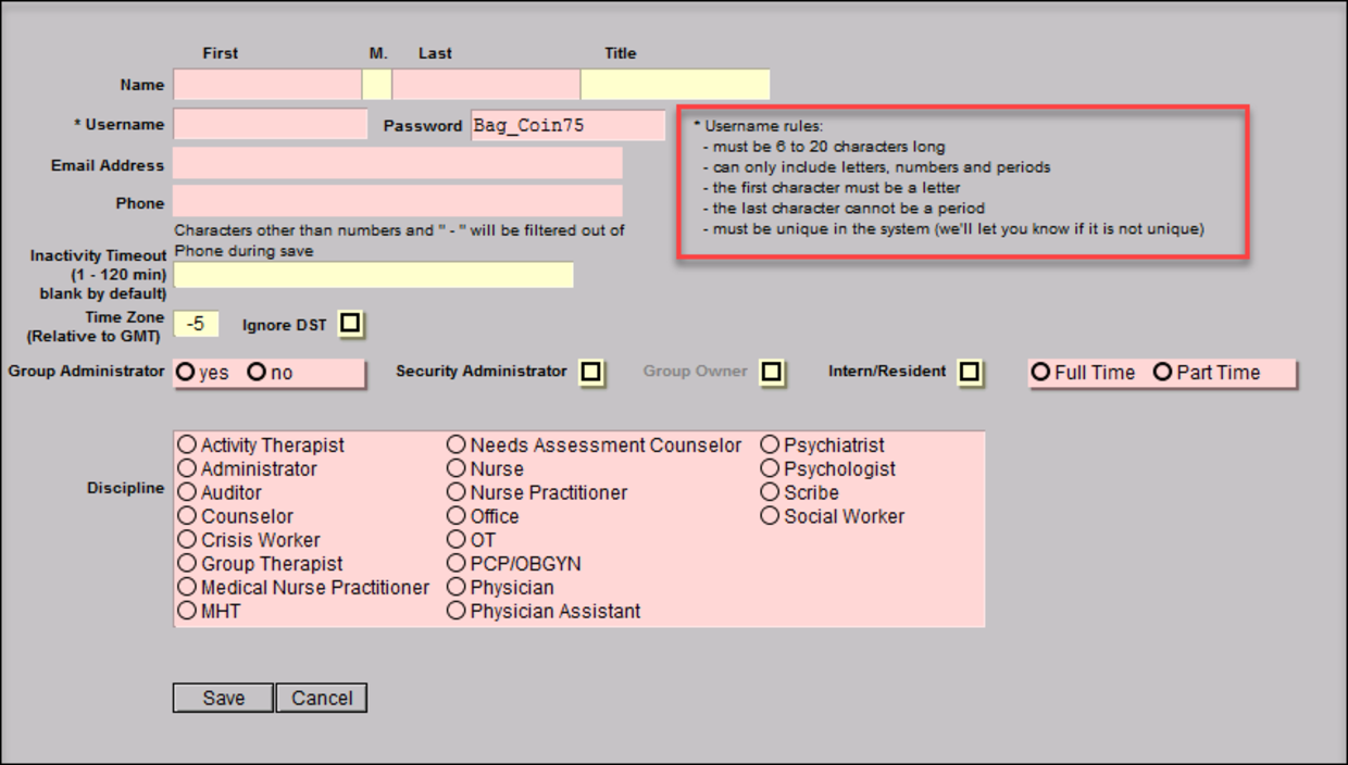 Username rules are stipulated now in the "Add a User" screen. When a Security Admin is creating a username and this does not meet the requirements, the system will not save the username.