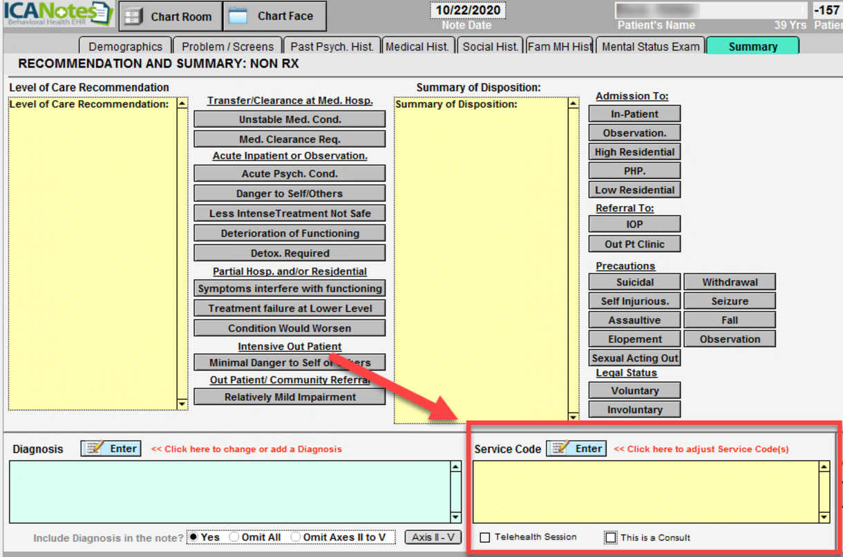 We have added an option to include a service code within the Summary tab of the Chemical Dependency Pre-Admission Assessment.