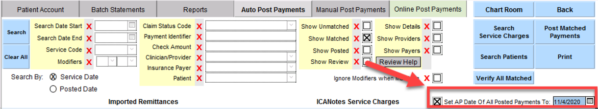The Posted Date for a batch of posted payments can now be defined via the Auto Post Payments window. Simply search for the payments, then choose Set AP Date of All Posted Payments to: check the box and enter the appropriate date before posting. Leaving the box unchecked will use the current date as the posted date.