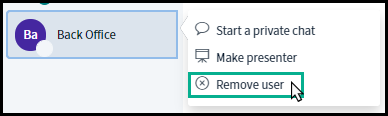 To remove an individual participant from the session, click the participant's name. This will populate a menu that will allow you to Start a private chat, Make Presenter or Remove user.