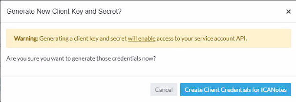 8. When this warning appears, click the 'Create Client Credentials for ICANotes' button.