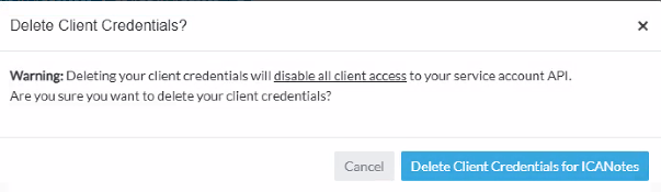 6. When this warning appears, click the 'Delete Client Credentials for ICANotes' button.