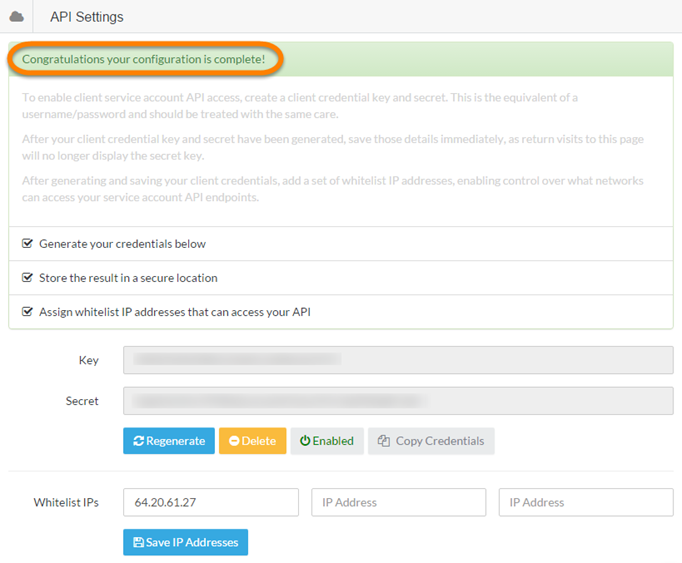 Note: Once you leave this screen you will no longer be able to copy the Key or Secret. Be sure that you have copied the credentials before you navigate from this screen.