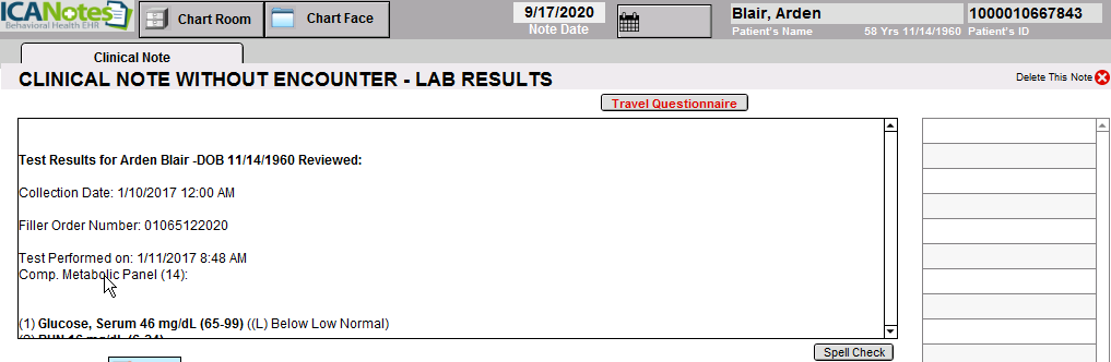 CLINICAL NOTE: When the clinician clicks the CLINICAL NOTE button, a Clinical Note Without Encounter will be created and the lab test results will be automatically populated in the note.