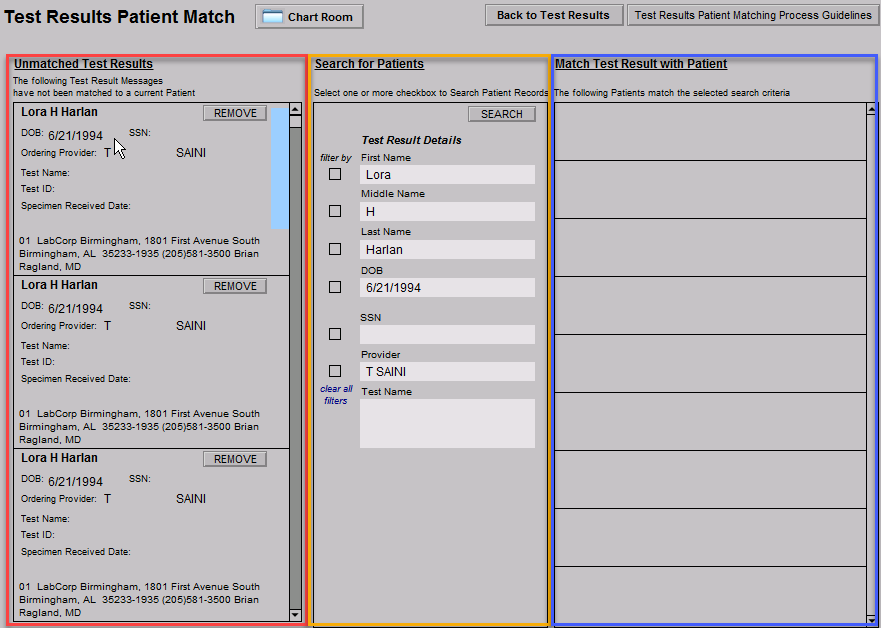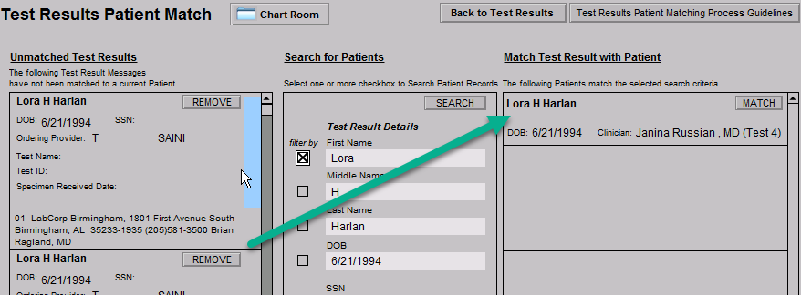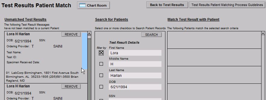 Note: Each Unmatched Test Result will need to be individually matched to the correct patient. If any of the results cannot be matched to a current patient, the lab should be contacted.