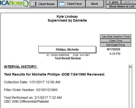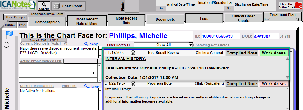 This is what the compiled progress note (called Test Result Review) will look like:
