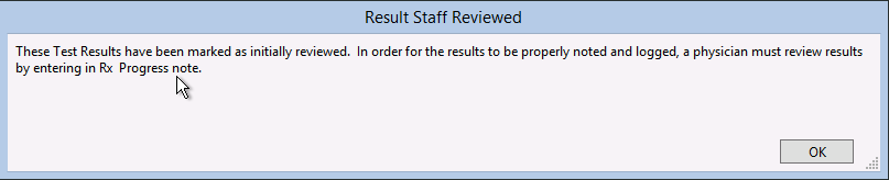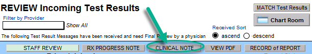 As soon as the clinician has clicked the RX PROGRESS NOTE or CLINICAL NOTE button, the results are no longer available in the Review Incoming Test Results window. If all test results have been reviewed by the clinician and moved to the Test Results Review report (RX Progress Note), the Chart Room button will be grey and the Review Incoming Test Results window is no longer available (until new lab results arrive).